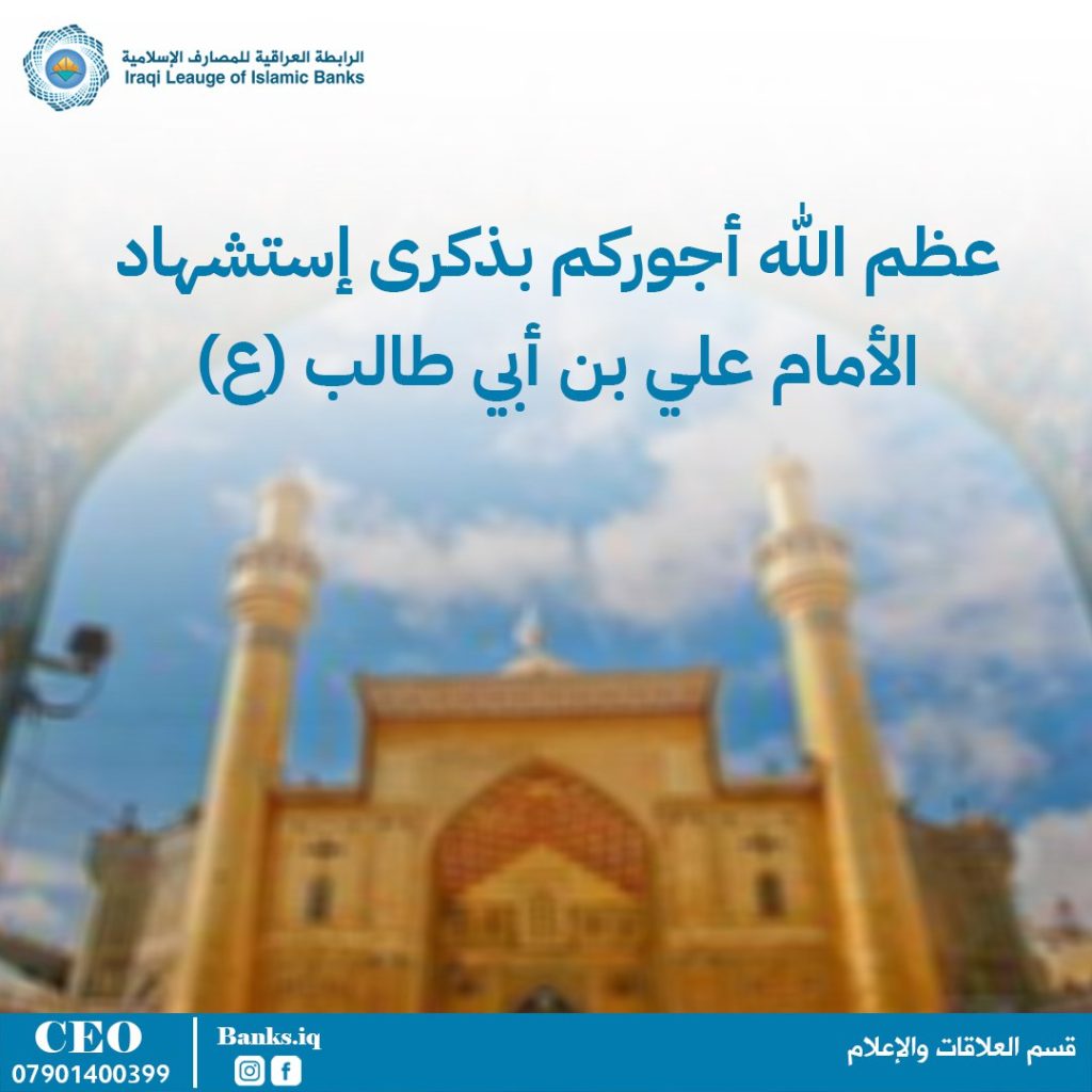 تتقدم الرابطة العراقية للمصارف الإسلامية بأحر التعازي والمواساة للأمة الإسلامية والمسلمين بذكرى إستشهاد امام العدل والانسانية امير المؤمنين ومولى الموحدين علي بن أبي طالب عليه السلام