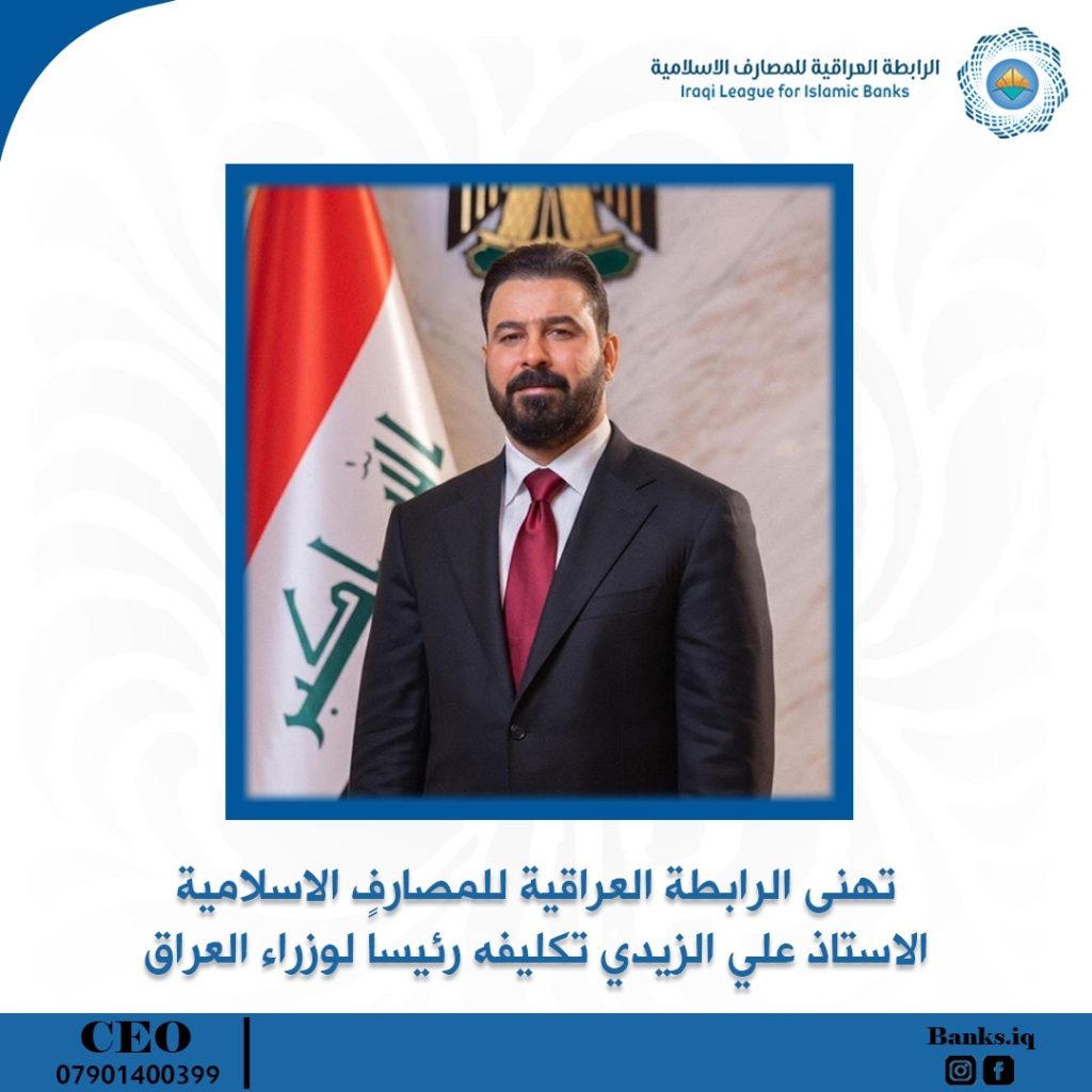 تتقدم الرابطة العراقية للمصارف الإسلامية، بأسمى آيات التهاني والتبريكات إلى السيد (علي الزيدي) بمناسبة نيله ثقة الإطار التنسيقي وترشيحه، ومن ثم صدور المرسوم الجمهوري بتكليفه بتشكيل الحكومة العراقية الجديدة.