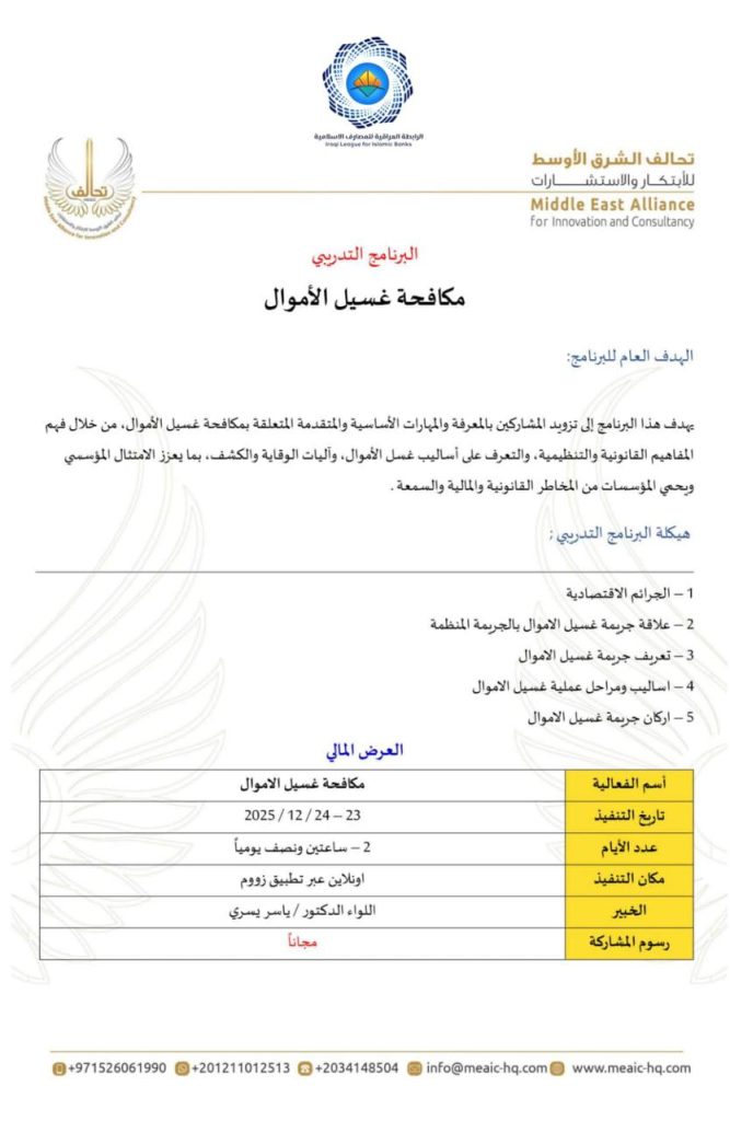 والتي تُنظم بالتعاون مع تحالف الشرق الأوسط، بهدف تعزيز مهارات الكوادر المالية والمصرفية في مواجهة الجرائم المالية وضمان الامتثال للمعايير الدولية والمحلية.